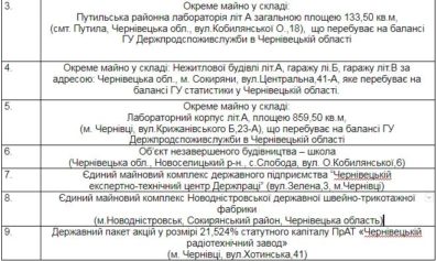 - Окреме майно у складі: Лабораторний корпус літ.А, площею 859,50 кв.м, що перебуває на балансі Головного управління Держпродспоживслужби в Чернівецькій області;