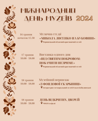 Чернівецький обласний краєзнавчий музей підготував до Міжнародного дня музеїв цікаві заходи. Серед них – музичні студії «МИКОЛА ЛИСЕНКО НА БУКОВИНІ», виставку старовинних ікон «ПІД СВЯТИМ ПОКРОВОМ: ПОБАЧИТИ НЕЗРИМЕ» та музейний вернісаж «З ФОНДОВОЇ СКАРБНИЦІ».