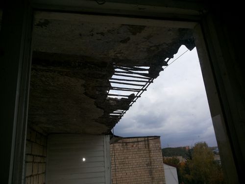 Запитаєте, що ж, власне, трапилося? Річ у тім, що мешкаю на 5-му поверсі. Над балконом і вікном розташований бетонний дашок, як люди кажуть – козирок. І ось він почав потихеньку розвалюватися. Вже стирчить арматура, а шматки бетону відвалюються і падають униз.