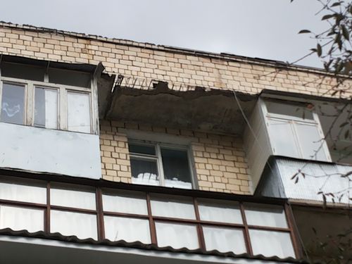 Сусід з 4-го поверху незадовго до смерті засклив балкон і накрив його металочерепицею. На неї й падають шматки бетону, трощачи вщент. Дружина його на заробітках за кордоном, інколи син заходить. І вже кілька разів у мене запитував, що там за бомби падають?