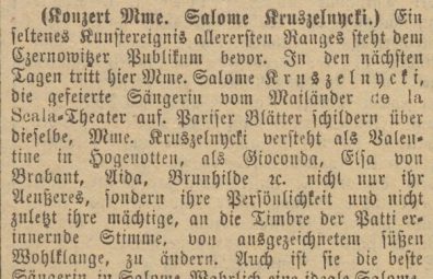 Сьогодні відома драматична артистка Саломея Крушельницька прибула до Чернівців, щоб виступити з концертом, запланованим на завтра, суботу, в Музичній залі. Публіка з нетерпінням чекає цього приємного концертного вечора, оскільки Крушельницька, яка виступає в Ла Скала в Мілані, мала великий успіх на своїх концертних турах і вперше виступатиме в нашому місті. Крім того, програма розширена тим, що артистка виконає пісні Нев’ядомського та Млинарського, а також арії Дідони та Тоски. Квитки, що ще є в наявності, можна придбати в музичному магазині B. Klein, Ratlzausstraße 17,та в касі музичного клубу».