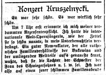 «О 7-й годині я вперше згадав про свій «проклятий обов’язок рецензента». До того часу я витісняв у підсвідомість «міжнародну світову оперну співачку», як її так гарно іменувала афіша. Один добрий знавець імен, який до найдрібніших подробиць знає всі родинні зв’язки рутенських родин Буковини й навколишніх частин світу, знав, що вона є чи то сестрою дружини зятя, чи щось подібне. Я був готовий до одного з тих жахливих «сімейних вечорів», де замість контакту між митцем і публікою панує банальна інтимність дядьків і тіток. Потайки такий собі «пан кузен» проклинає Орфея, Тубалкаїна та інших людей, яких підозрюють у винайденні музики… але наприкінці він захоплено аплодує і наполегливо вимагає «біс». До цього додається ще й те піднесення, яке розглядає приналежність до нації як підставу для звільнення від покарання за злочини проти мистецтва…