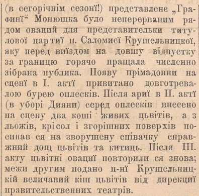 Чи були ці високі похвали справді заслуженими, покажуть лише наступні ролі, які Крушельницька тут співатиме. Особливо захопливою є анонсована вистава в опері Монюшка «Графиня».