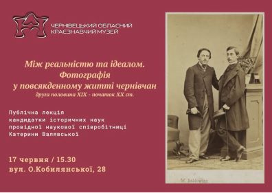 У вівторок, 17 червня у Чернівецькому обласному краєзнавчому музеї відбудеться лекція кандидатки історичних наук, провідної наукової співробітниці відділу науково-освітньої та науково-методичної роботи Катерини Валявської «Між реальністю та ідеалом. Фотографія у повсякденному житті чернівчан (друга половина ХІХ – початок ХХ століття)».