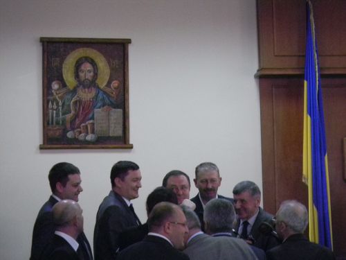 А далі все відбувалося як у Верховній Раді: опозиціонери заблокували трибуну. Тож оголосили перерву. Коли роботу продовжили, опозиція знову намагалася заблокувати трибуну, але їй на шляху стали кілька регіоналів. І почалося найцікавіше для наших колег телевізійників. Картинка вийшла хоч куди! Стінка на стінку – штовхалися солідні чоловіки-депутати. І тут в одного з регіоналів не витримали нерви і він з кулаками поліз на «фронтовика» Салагора. Це стало спалахом сірника перед купою сухого хмизу – зчинилася бійка. Голова облради Гайничеру оголосив перерву.
