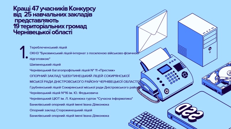 У фіналі конкурса виступали представники таких навчальних і позашкільних закладів: Тереблеченський ліцей, ОКНЗ «Буковинський ліцей-інтернат з посиленою військово-фізичною підготовкою», Шипинецький ліцей, Чернівецький багатопрофільний ліцей № 11 «Престиж», Шебутинецький ліцей Сокирянської міської ради, Грубнянський ліцей Сокирянської міської ради Дністровського району, Чернівецький ліцей №16 ім. Ю. Федьковича, Чернівецький ЦЮТ ім. Л. Каденюка гурток «Сучасна інформатика», гурток «Байт» Чернівецького ОЦНТТУМ, Банилівський опорний ліцей імені Івана Діяконюка, Опорний заклад Сторожинецький ліцей, Чернівецький ліцей №14 тощо.