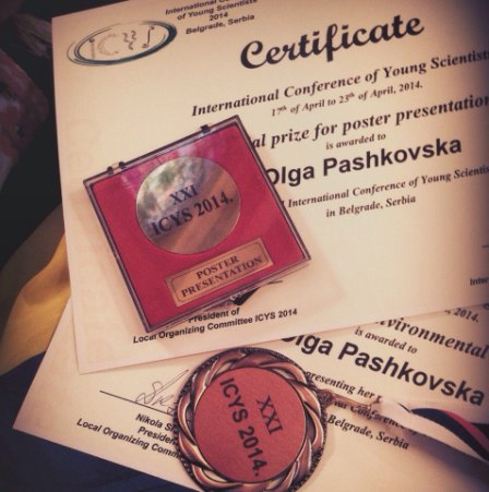 На міжнародній конференції молодих учених ICYS у м. Белград (Сербія), що проходила від 17 до 23 квітня 2014 року за участі 127 делегатів з 15 країн світу, здобула бронзову медаль та нагороджена золотою медаллю за найкращий постерний захист.