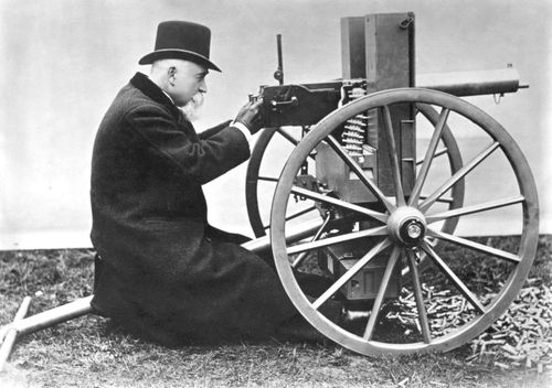 Та справжньою «машиною смерті» на полі бою став кулемет. Він з’явився на світ завдяки патронам із бездимним порохом, які дозволили автоматизувати процес перезаряджування зброї. Першу дієву модель кулемета випробував 1884 року конструктор Хайрем Максим (1840-1916). Народжений у США, він згодом переїхав до Британії, відтак його винахід вважають «своїм» як американці, так і британці. А Велика Британія вела майже безперервні колоніальні війни, тож відразу відправила нову зброю до Африки. Коли воїни повсталих племен, потрясаючи списами, пішли в атаку на англійські позиції, їх за лічені хвилини цілком викосив кулеметний вогонь. Захисту від цієї зброї африканці не знали. Але його знайшли ворогуючі сторони російсько-японської війни 1904-1905 рр. Росіяни та японці застосовували кулемети в бою, що зробило неможливими звичні атаки піхотинців, які рухалися на противника щільними стрілецькими ланцюгами. Кулеметний вогонь змушував піхоту залягати й пересуватися поповзом. Від зливи куль солдати ховалися також в окопах і траншеях. «Машина смерті» змусила докорінно змінити тактику піхоти і кавалерії.
