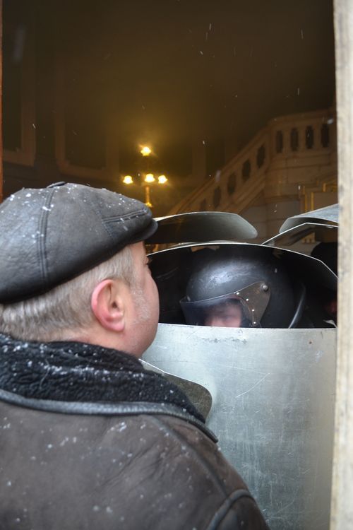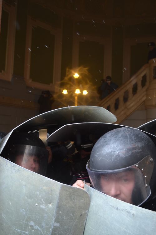 Я сам жёстко критикую Зарайского, но в этот раз он, действительно, всё время был в первых рядах и наражався на небезпеку, травился газом и дымом и даже получил травму. Его действия я, тоже находясь на передовой внутри здания, неоднократно фиксировал на видео. В меня тоже летело разбитое стекло, палки, дымовые шашки и снежки, у меня слезились глаза и першило в горле от дыма и газа, которым больше травились менты (они же сами его и пускали!), журналисты и люди в штатском (марионетки Папиева), отдававшие приказы мусорам. Но я, как и Зарайский, пытался побольше зафиксировать происходящее крупным планом, во всех деталях.