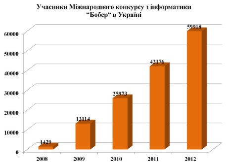 11-16 листопада 2012 року був проведений черговий V Міжнародний конкурс “Бобер”. У ньому взяли участь більше 500 тисяч учнів з 22-х країн світу. Найбільш масово конкурс пройшов у Німеччині (180 тис. учасників), Франції (90 тисяч) та Україні (60 тисяч).