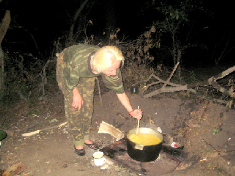 Повертаючись до табору, солдати підкинули ідею організувати романтичну вечерю. Їм хотілося чогось смачного, що створило б домашню атмосферу. Мою пропозицію зварити бануш хлопці підтримали «на ура». Та перед цим мені дали можливість скористатися літнім душем, який вони облаштували поруч із табором. Бо після поїздки в усіх нас лише очі світилися. Хлопці тим часом пішли до лазні: у таборі працює пересувна лазня – дезинфекційно-душовий автомобіль (ДДА). А далі ми взялися разом до приготування вечері: солдати розпалили багаття й натерли овечої бринзи, я замісила бануш. Сіли вечеряти в альтанці, яку хлопці теж змайстрували своїми руками. Зав’язалася невимушена розмова, якої, як зізналися хлопці, їм теж бракує. Вони не боялися вже говорити про те, що стомилися за ці кілька місяців боротьби, що їх дратує слово «перемир’я», що вони не мають достатньої інформації про ситуацію в Україні і що вони хочуть до своїх батьків, дружин і коханих… Мобілізовані вояки не розуміють, за яким принципом їх мобілізували: адже, за їхніми словами, з села забирали по двоє-троє хлопців, як правило, з малозабезпечених сімей.