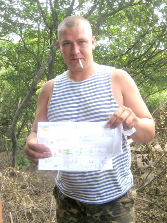 Зранку приїхав черговий бусик з допомогою від Буковини. Він мав забрати мене, а далі ми планували відвезти передачі на передову, однак у штабі сказали, що туди не пустять, оскільки на той момент ситуація там загострилася. Тож розвантажили бусика у таборі: вантаж пообіцяли доправити на передову при наступному виїзді «шаланди». Та у мене в сумці лежав дитячий малюнок, який синок моєї колеги просив передати солдатам. Я ж планувала передати його саме на передову. Та, зрозумівши, що туди не потраплю, я урочисто вручила малюнок 6-річного Жені Ополоника буковинським хлопцям. І вони зраділи подарунку, наче діти… Подякували і повели мене за собою. Неподалік від табірної кухні встановлена спеціальна дошка, на якій уже було кілька дитячих малюнків. І тут же солдат повісив малюнок Жені.