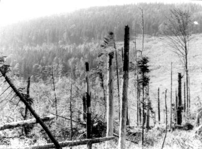 Привернув увагу незвичайний тип лісоповалу. Звичайні буреломи в горах утворю-ються поблизу гребенів хребтів, де вітри досягають найбільшої сили, чи в місцях фронталь-ного оголення суцільними рубками високих стиглих чи перестиглих деревостанів. У даному випадку зона лісоповалів витягнулась майже суцільною 20-кілометровою смугою 100–150-метрової ширини по азимуту 1100 – 2900, тобто під гострим кутом до домінуючого тут на-прямку простягання основних хребтів 1400 – 3200. При цьому смуга була однаково чітко ви-ражена у гребеневих частинах хребтів, на виположених та крутих схилах, у днищах вузьких долин.