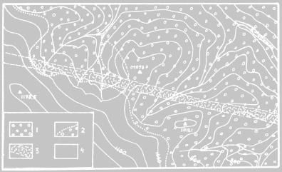 Ситуація з буреломом в басейні р. Лопушна, Вижницький район (фрагмент).Масштаб 1 : 25000. Умовні позначки: 1.лісопокрита площа, 2.межа лісу, 3.смуга бурелому, 4.гірські луки.