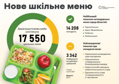 Готові шкільні меню затверджує Держпродспоживслужба (ДПСС). За її даними, більшість шкіл України досить непогано справляються із переходом на нові стандарти. Станом на початок листопада, Держпродспоживслужба розглянула 17 550 шкільних меню і затвердила 14 208 з них. За словами фахівців служби, у регіональному розрізі тільки 20% від всіх поданих меню повертають на доопрацювання. Наразі найбільший показник затверджених меню у Тернопільській, Івано-Франківській, Київській та Хмельницькій областях.