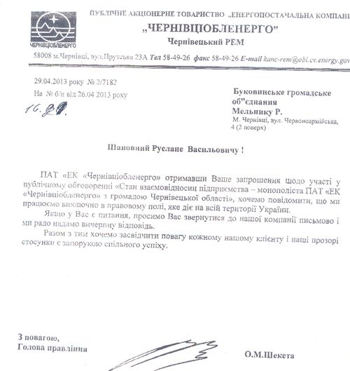 Однак не так сталося, як гадалося. Монополіст продемонстрував свою зверхність і небажання співпрацювати з громадою. Ось реакція Обленерго на запрошення взяти участь в обговоренні проблеми: