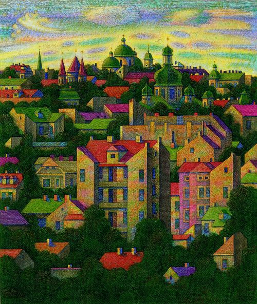 Художник пригадує, що перші міські краєвиди починав малювати наче з висоти пташиного польоту. Місто, що здалеку нагадувало старовинну гравюру, на якій неможливо розглядіти деталі, хотілося показати романтичним і привабливим. З роками погляд автора ставав глибшим та іронічно-філософським. Велич і краса поряд із абсурдом сучасного сформували карикатурну дійсність, на яку перетворюється матеріальна культура Західної Європи.