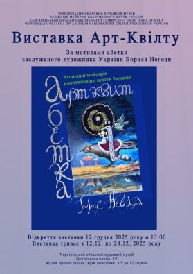 Виставка «Арт-Квілт. Абетка» – це унікальний текстильний проєкт, який об’єднав майстрів клаптикового шиття з усієї України. М, За мотивами пастельних творів заслуженого художника України Бориса Негоди майстри створили серію квілтів – композицій у техніці клаптикового шиття. Проєкт створений за сприяння Асоціації майстрів клаптикового шиття України, Кам’янець-Подільського університету імені І. Огієнка, Чернівецького обласного художнього музею, Чернівецької обласної організації Національної спілки художників України.