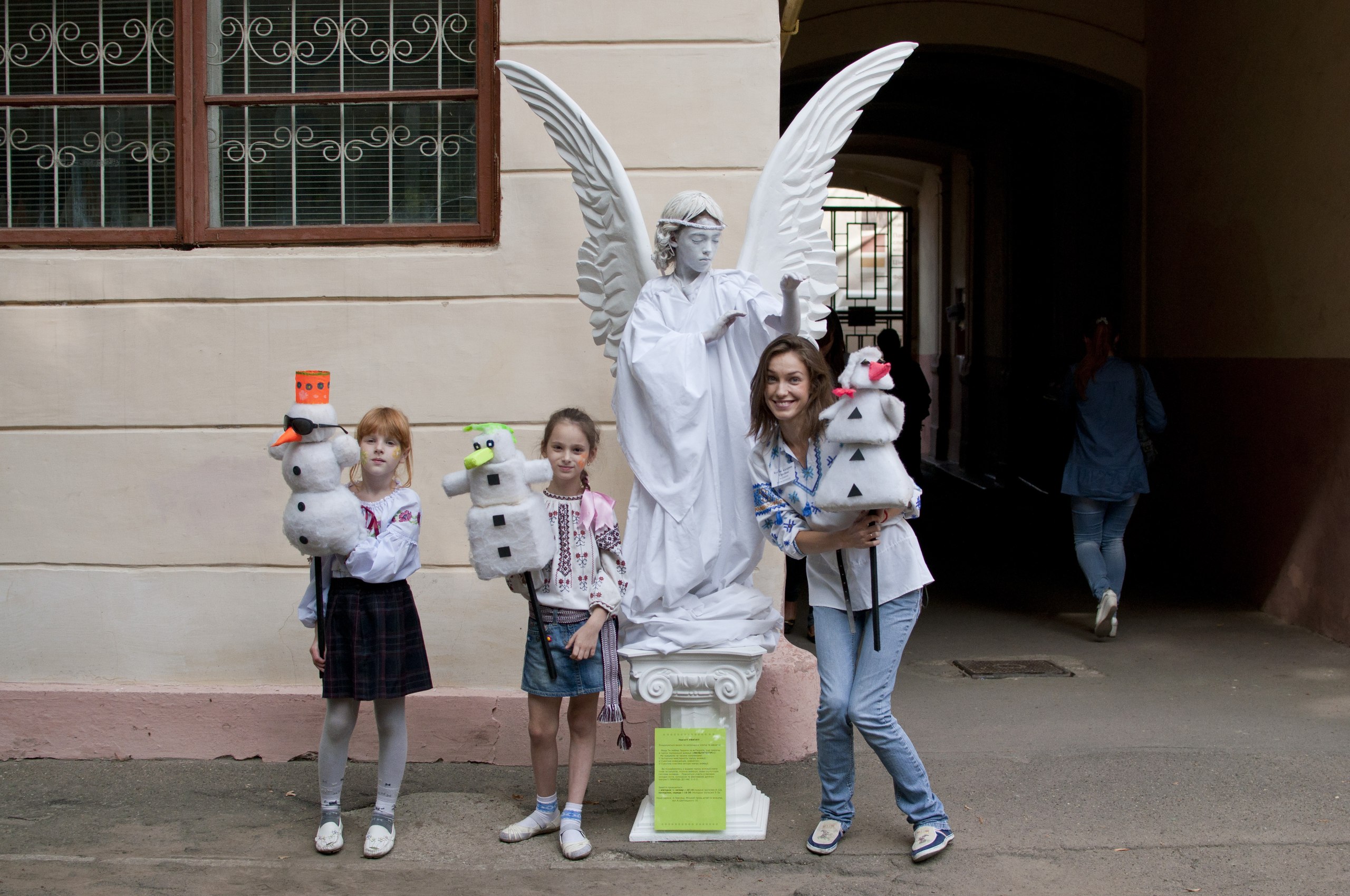 – Займаємося безпосередньо анімацією, тобто оживленням предметів, речовин, ляльок, частин тіла людини. От бачите, зараз ми оживлюємо статую, – підводить мене Катерина Бутняк до своєї юної вихованки в образі білосніжного янгола.
