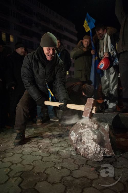 «У вас унікальна можливість придбати шматочок історії – частинку Леніна, поваленого 8.12.13… Вартість частинок Леніна залежить від частини тіла і ваги. Долоня коштує 1000 грн, шматочок руки – 750 грн. Шматки ніг і тулуба продаємо на вагу – 50 грн за кіло. Голова – безцінна. За неї пропонуйте свою ціну».