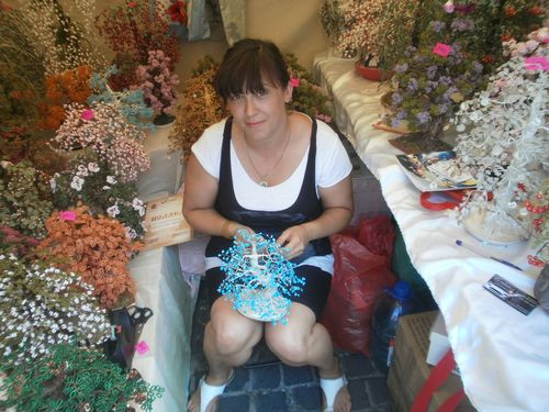 Коли я роблю дерево, то не ріжу дріт шматочками, а населяю його метрів 5 – так економиться дріт і час. Накрутивши потрібну кількість пучків – 100-200, – дерево можна збирати. Це робиться за допомогою спеціальних флористичних дротиків. Тоді береться якась тверда основа – чи електрод, чи мідний твердий дріт – пучки збираються докупи, обмотуються нитками, а потім стрічкою. Далі, аби дерево мало привабливий блиск, воно покривається лаком. Свого часу, загіпсовуючи горщик, зіткнулася з ситуацією, коли він тріскає. Для того, щоби цьому запобігти, я кладу на дно горщика пінопласт, а гіпс заливаю шарами.