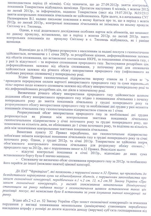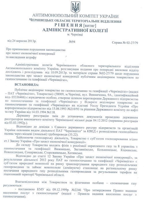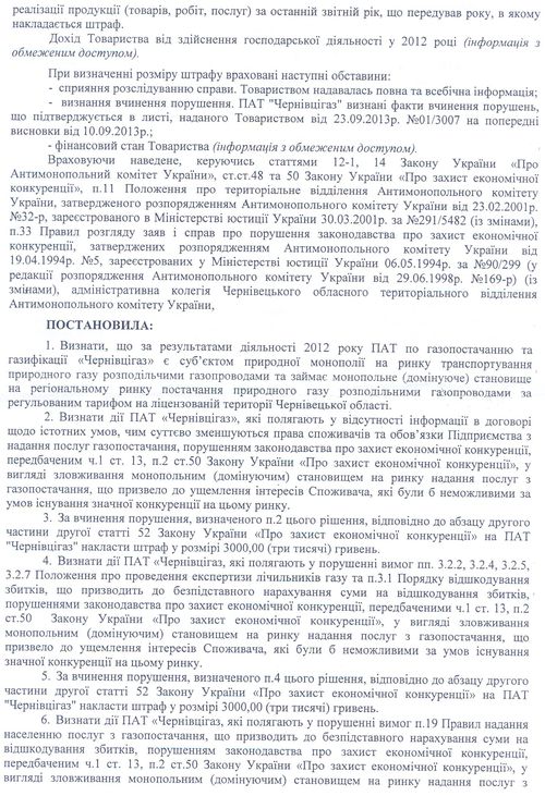 «Враховуючи наведене, керуючись статтями (йде величезний перелік антимонопольного законодавства – Мельник), адміністративна колегія Чернівецького обласного територіального відділення Антимонопольного комітету України постановила:» – і знову йде перелік порушень з 9-ти пунктах. За чотирма із них накладаються штрафи по 3 тис. грн. А 10-им пунктом ПАТ «Чернівцігаз» зобов’язують припинити порушення, й 11-им – письмово повідомити про це територіальне відділення до 1 грудня 2013 року.