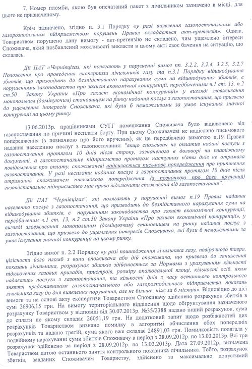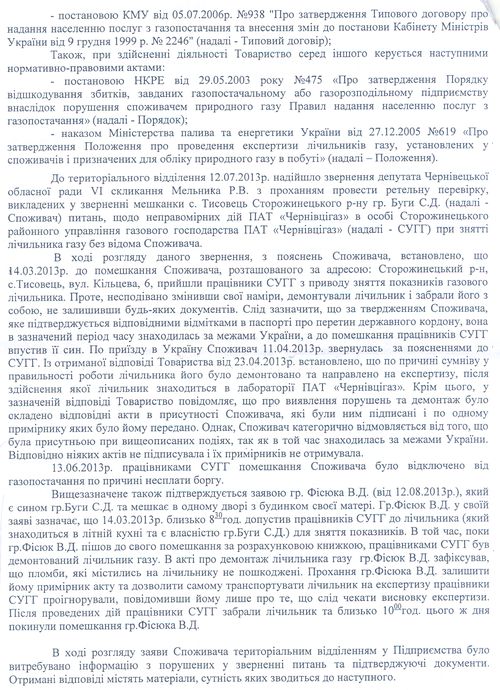Від редакції: Далі п. Мельник лише цитуватиме витяги з рішення Адмінколегії щодо найпринциповіших моментів і висновків, а суть справи, описану там-таки, викладе своїми словами стисло і коротко. Бо чиновницьку мову зрозуміти дуже важко – вона мутна й заплутана. Для прикладу, з цього рішення не зрозуміло, як саме штрафуватимуть «Чернівцігаз»: знімуть за кожен порушений пункт по 3 тис. грн, а їх там – чотири і тому загальна сума складе 12 тис. грн., чи підприємство сплатить усього 3 тисячі? Адже загальна сума у рішенні не вказана!