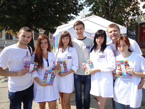 Волонтери акції у білих халатах та футболках ЧЕСНО роздають перехожим і всім бажаючим своєрідну вакцину доброчесності – листівки із написом «Тест твого депутата».