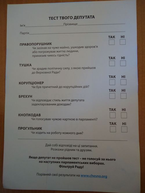 Організатори акції та активісти руху ЧЕСНО пропонують на площі буковинцям протестувати діючих народних обранців на відповідність шістьом критеріям доброчесності :