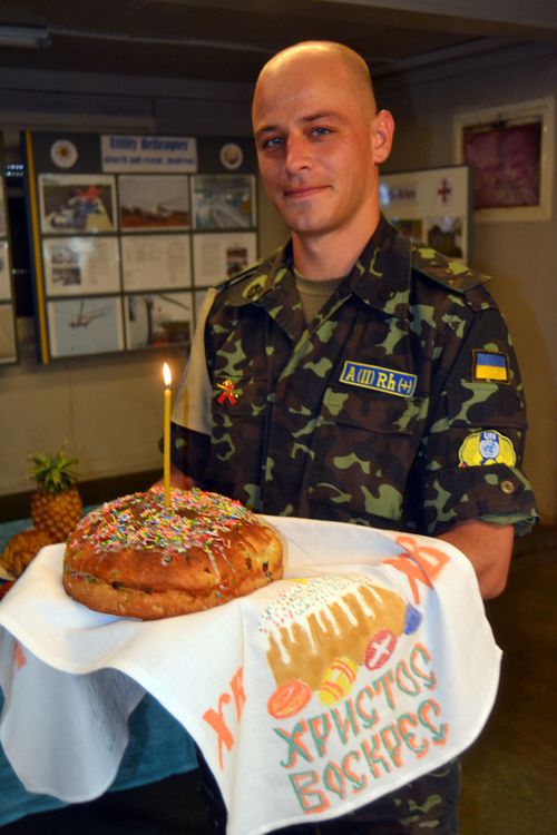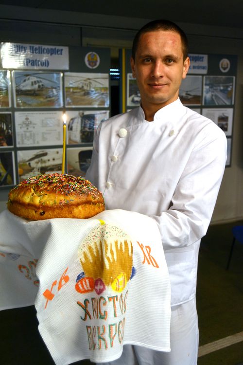 – Кухарі практикувалися у випіканні паски. Охочі допомагають кухарям розмальовувати писанки, – розповідає начальник продовольчої служби капітан Валентин Рачинський, – На кожному столі будуть паска, писанки, масло, сир та ковбаса Охочі можуть поставити свічку до ікони.