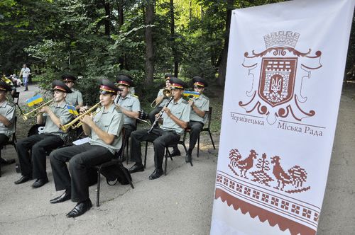 На майданчику біля фонтану у неділю ввечері в чернівецькому парку культури та відпочинку ім. Т. Г. Шевченка. відвідувачі мали змогу насолодитися грою духового оркестру 300-го механізованого полку.