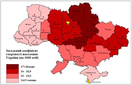 В окремих регіонах України темпи смертності майже такі ж, як у роки Голодомору. Скажімо, у Дніпропетровській області смертність у 1932 році склала 17,0 на тисячу осіб, а в 2011-му смертність склала майже 16 випадків на тисячу осіб.