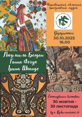 Завтра, 30 жовтня, о 16.00 у Чернівецькому обласному краєзнавчому музеї відбудеться відкриття виставки Чернівецької обласної організації Національної спілки художників України, де свої твори представлять Людмила Богдан, Ганна Фочук та Ірина Шканде.
