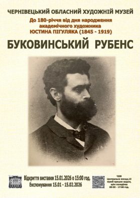 Запрошуємо всіх охочих долучитися до культурно-мистецького заходу з нагоди урочистого відкриття виставки «Буковинський Рубенс», присвяченої 180-річчю від дня народження академічного художника Юстина Пігуляка (01.11.1945-02.06.1919). Імпреза відбудеться 15 січня 2026 року о 15:00 за адресою: Чернівці, Площа Центральна, 10.