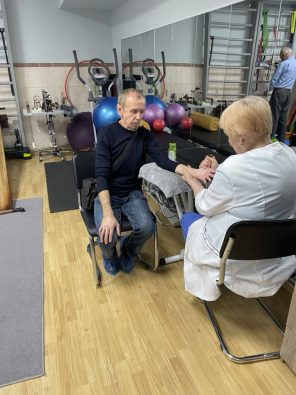 У Валерія Русанова перелом променевої кістки лівої руки. Асистентка з реабілітації Валентина Дубіцька робить йому останній 10-ий масаж. «Вмілі руки пані Валентини повернули мені практично весь об’єм руху рукою», – не приховує своєї радості чоловік.