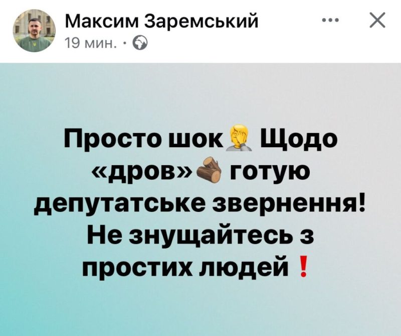 Людей, у тому числі виборців Зеленського, це так збурило, що колега Павлюка по фракції та партії, мажоритарник Максим Заремський, на людях заспівав таке: “Просто шок! Щодо “дров” готую депутатське звернення! Не знущайтеся з простих людей!”, – написав він у себе на Фейсбук після того, як люди на окрузі мало не надавали йому по картузові.
