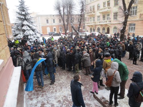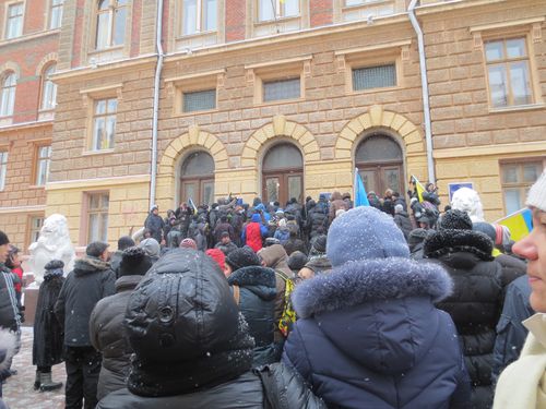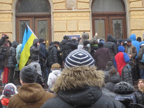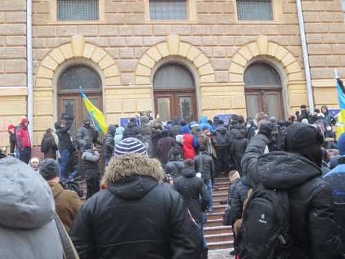 Сьогодні о 10.00 повинна була розпочатися позачергова сесія обласної ради з порядком денним – прийняття обласного бюджету. Та вже з самого ранку будинок з левами оточили мітингувальники. Люди стояли, піднявши вгору написані від руки гасла.
