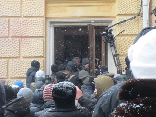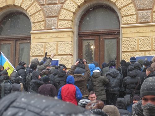 Та оскільки, як завжди, народні протести не знаходять відгуку в серцях чиновників, вимогу мітингувальників проігнорували. І вони пішли на штурм облдержадміністрації . Розбили скло та двері з бокового входу. Однак кордон міліціонерів не дозволив натовпу потрапити всередину приміщення. Тоді мітингувальники перебазувалися до центрального входу . Між штурмом, вигуками «Банду – геть» та «Папієва – сюди» співали Гімн України.