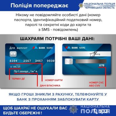 Заявник розповів поліцейським, що йому зателефонував незнайомець та представився працівником одного із банків. Під приводом відновлення користування банківськими картками псевдобанкір надіслав буковинцю СМС-повідомлення із кодом, який потрібно було продиктувати. Після виконаних дій із банківських рахунків чоловіка було списано понад 68 тисяч гривень.