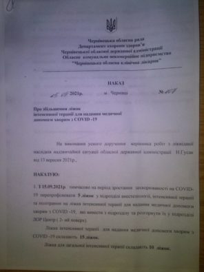 Тому наказ в.о. гендиректора № 107 від 15 вересня цього року змусив багатьох серйозно задуматися над тим, куди котиться лікарня? Наказ стосувався виконання усного доручення керівника робіт з ліквідації наслідків надзвичайних ситуацій Чернівецької ОДА Наталії Гусак. Дмитро Домбровський, маючи цілковито укомплектовану попереднім керівництвом реанімацію, вирішив за рахунок роздроблення реанімаційного відділення розгорнути ліжка інтенсивної терапії хворим з COVID-19 у інших відділеннях лікарні, які розташовані в різних корпусах і не мають для того аніяких умов.