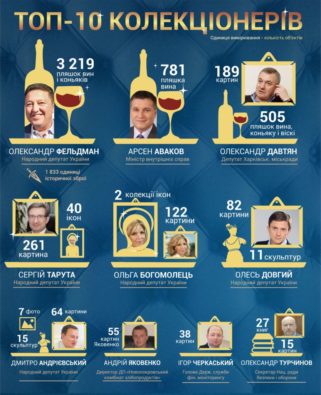 Перше місце у ньому виборов народний депутат, бізнесмен і просто мультимільйонер Олександр Фельдман. Щоб задекларувати всі свої зібрання, йому довелося проробити дійсно титанічний труд із підрахунку й інвентаризації. Вочевидь, у якийсь момент це заняття набридло навіть самому Олександру Борисовичу, і якщо спершу він вказував точну кількість пляшок у своїх колекціях вин і коньяків, то потім почав писати їх об’єм у літрах або просто найменування.