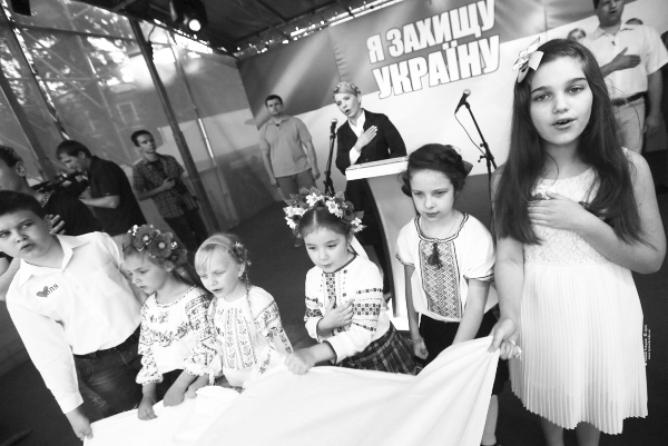 На завершення багатотисячного мітингу на Соборній площі юні чернівчани розгорнули великий саморобний прапор-рушник, на якому зображені серце, національний прапор та ім’я переможця президентської кампанії, на думку дітей, – ЮЛЯ.