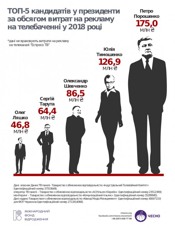 Також Порошенко став лідером за кількістю реклами в ефірах у 2018 році. Майже нарівні з ним опинився Шевченко. Ролики з кожним із цих кандидатів з’являлися в ефірах понад 4 тис. разів.