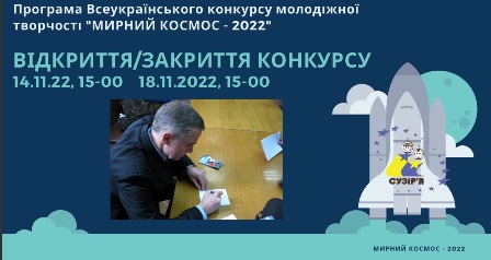 14 листопада 2022-го у Чернівцях стартував Всеукраїнський конкурс молодіжної творчості «МИРНИЙ КОСМОС» – 2022. Дата проведення – 14 – 18 листопада 2022 року. Формат проведення – за допомогою онлайн-платформи Google Meet. Всеукраїнський конкурс молодіжної творчості «Мирний космос» проводиться з метою виявлення, розвитку та підтримки творчої обдарованої учнівської молоді незалежної України в аерокосмічній […]